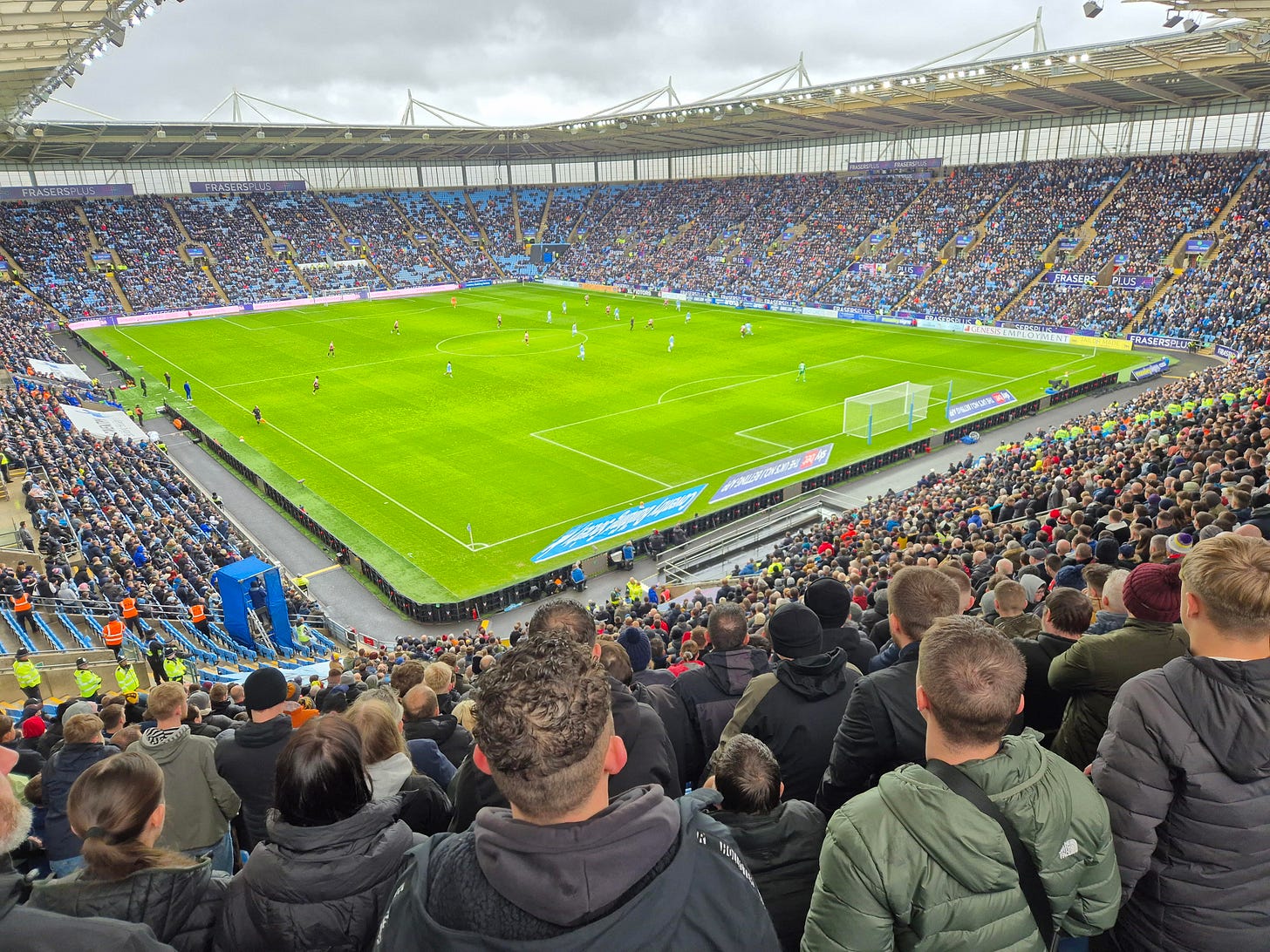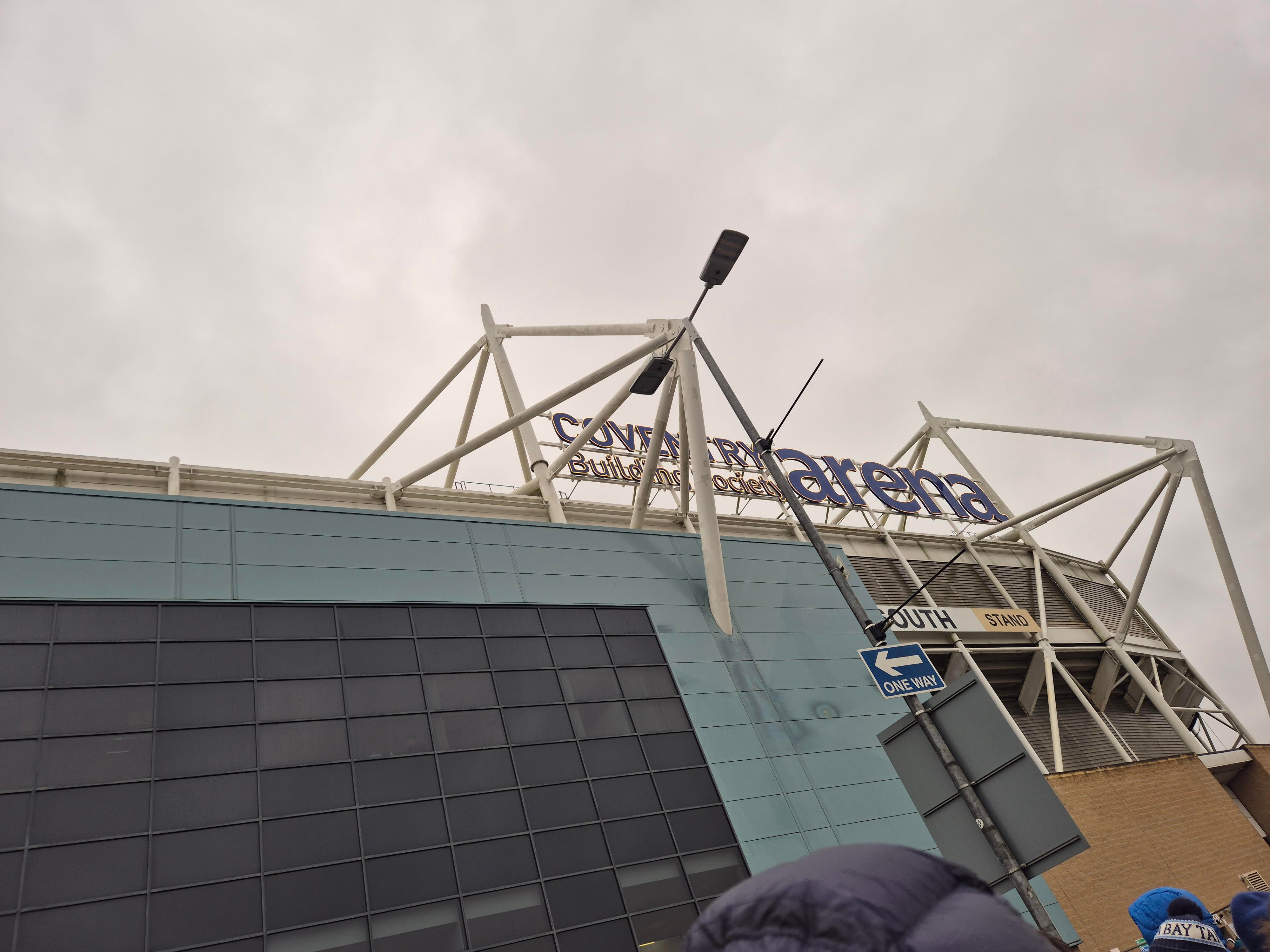 11.30 am soon rolls around, and after a full English and a couple of pints, we're on the road to the stadium. Ahhh, the stadium (Rolls eyes). I've been fairly clear in the past, I don't mind new stadiums. I'm not one of those people who think football should still be played in stadiums that were fit for purpose in 1931. I like new grounds. However — quite a big ‘however’ — when you plonk said new stadium out of town in the middle of Tescos car park, it does wind me up a bit. I'm not going to stoop to calling it soulless though, because now the Coventry fans have decided to end their strike, they do drum up a decent atmosphere. They've had some rough times, of course, but they seem to be over that now.