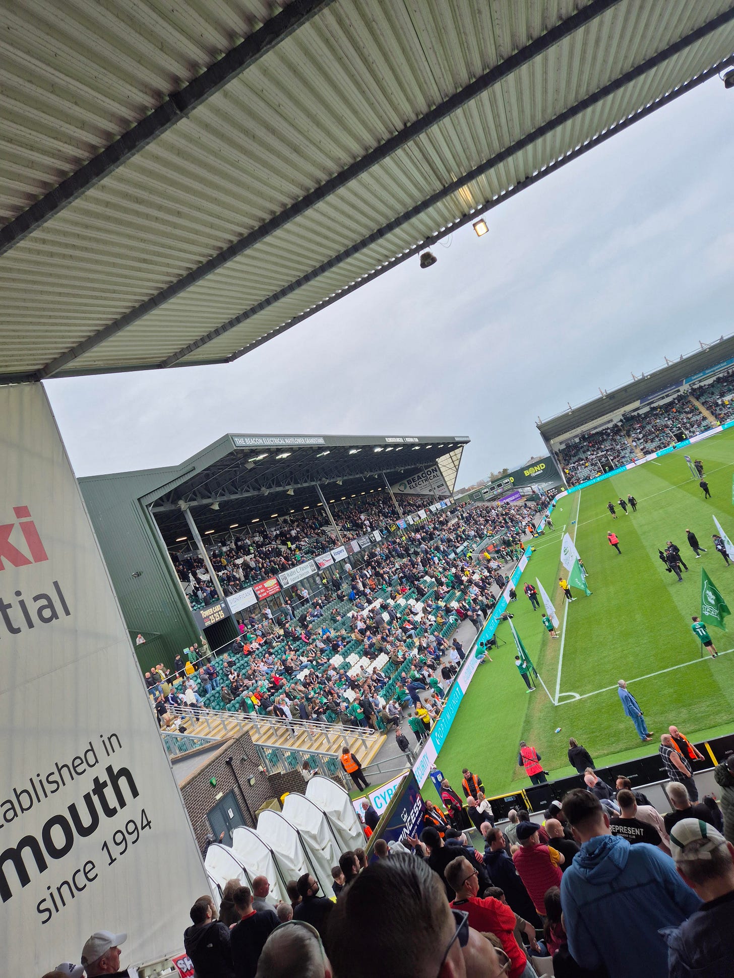 11:30am felt like 6pm, but we got back on the bus to head for Home Park. A quick 15-minute drive and we arrive. Plod have had us dropped off at the completely wrong side of the ground, so that’s good. We’ll just do the first leg of the Three Peaks to find the turnstiles then, shall we? And to my absolute delight, when I got there, I saw my mate Josh, who’s back home from Canada for two weeks. So happy to see him and arrange a beer for later that evening.
