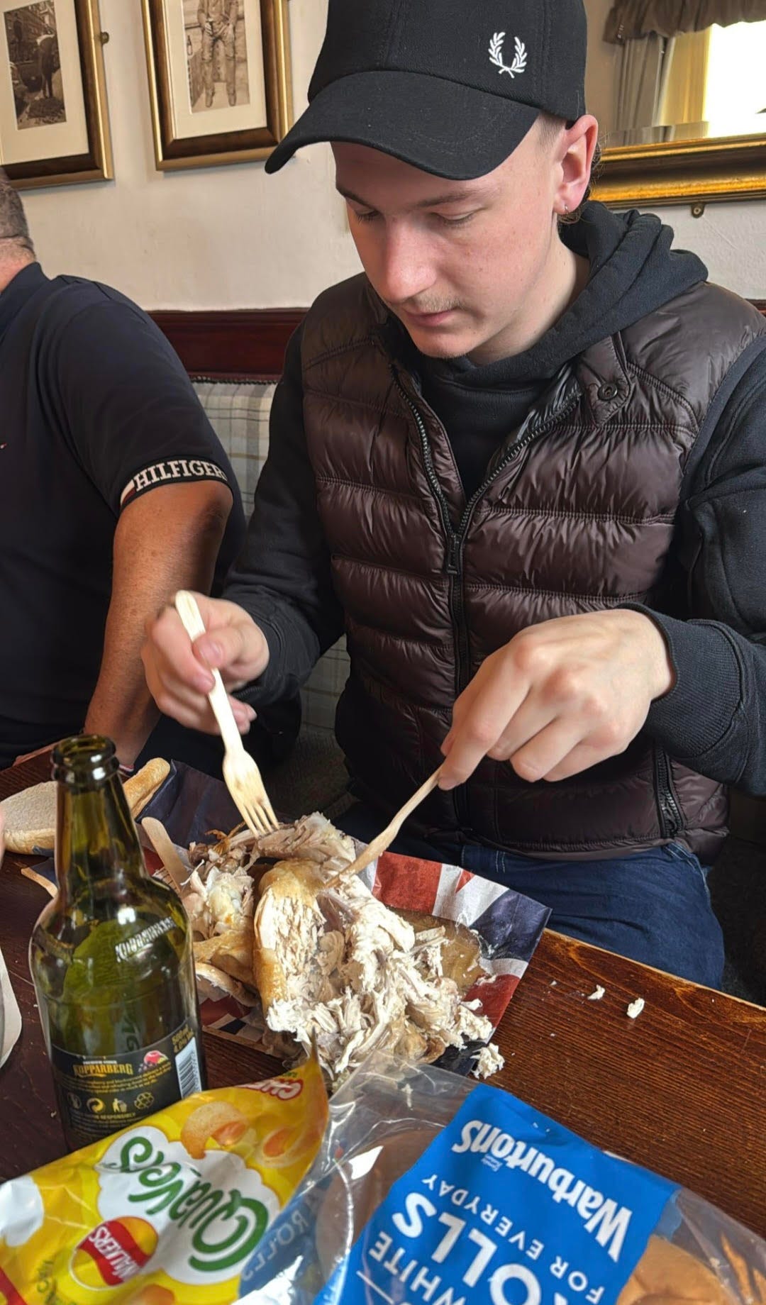 Tom Gregory absolutely dominated the pool table in the British Queen’s, and I fulfilled everyone's hunger with a Morrisons rotisserie chicken and breadcakes – don't start, that's the correct word. Young Jack Scabs doing his best impression of the carvery chef serving them up. We had a fab day out. And that's all that matters in the end. Who actually cares about football anyway? It just kicks you in the teeth, time after time.