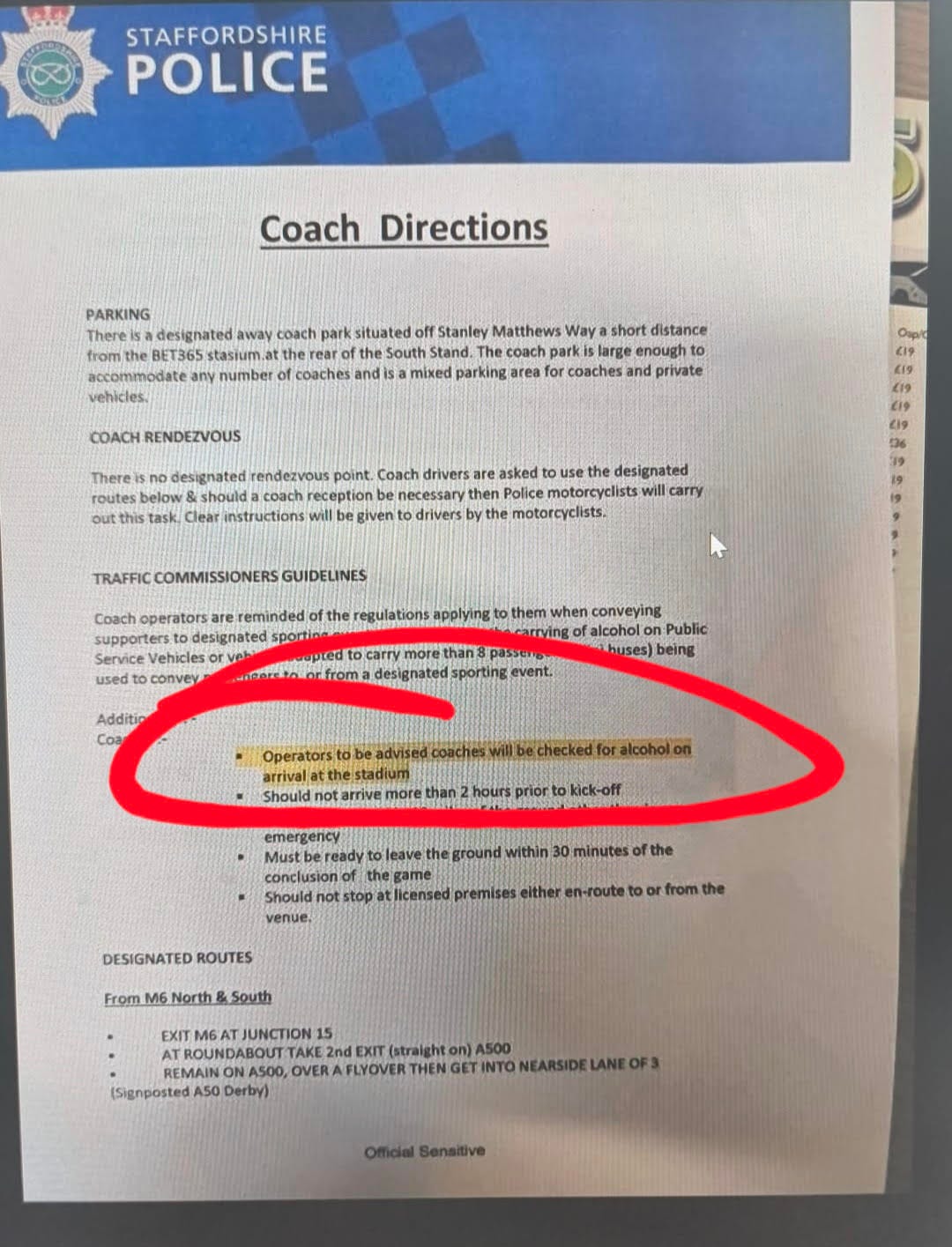 A late-ish set-off saw us leave Farm Road at 3:30pm to allow people to work, and we headed off down to Uttoxeter for a couple of hours for a few light refreshments. And as you can see, we were expecting a really warm welcome from Staffordshire’s finest. I've moaned about the way fans-only coaches get treated enough throughout the season, so I'll not bother boring you again... Anyway, Uttoxeter — lovely place. The three pubs we went in were traditional and welcoming. And you just got a sense that those who had travelled all seemed in really good spirits. And we'll need that spirit to continue beyond the Blackburn game.
