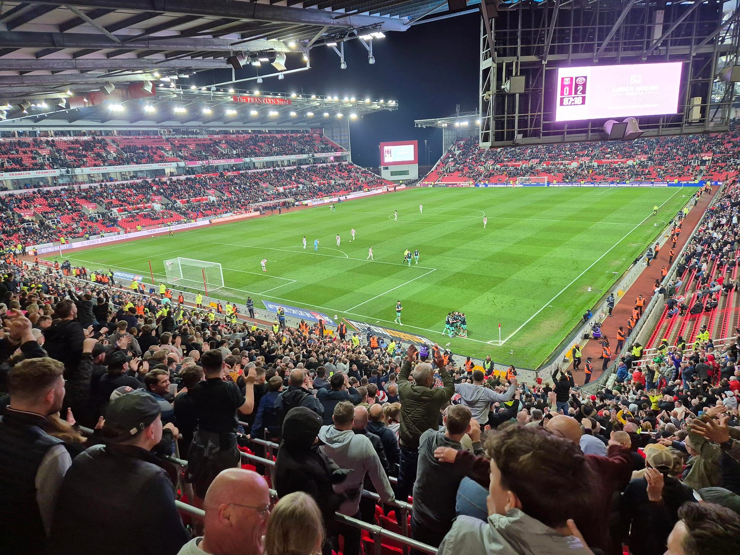 The Britannia Stadium then... new build, 1996?? Ish... not that new then, actually. I remember my first visit here on Boxing Day of 1997, I think it was. 2–2 draw. I've been back pretty much every time we've played here too, and still I cannot get my head around the fact that they built the main stand in a different postcode to the rest of the ground? You could land a plane between it and the pitch. Maybe the stadium architect left extra space for Rory Delap’s run-up? Who knows. Away fans have been moved now into the latest part of the build, in the corner. I dunno why, but you always get a better atmosphere going in a corner. It's one of life’s mysteries.