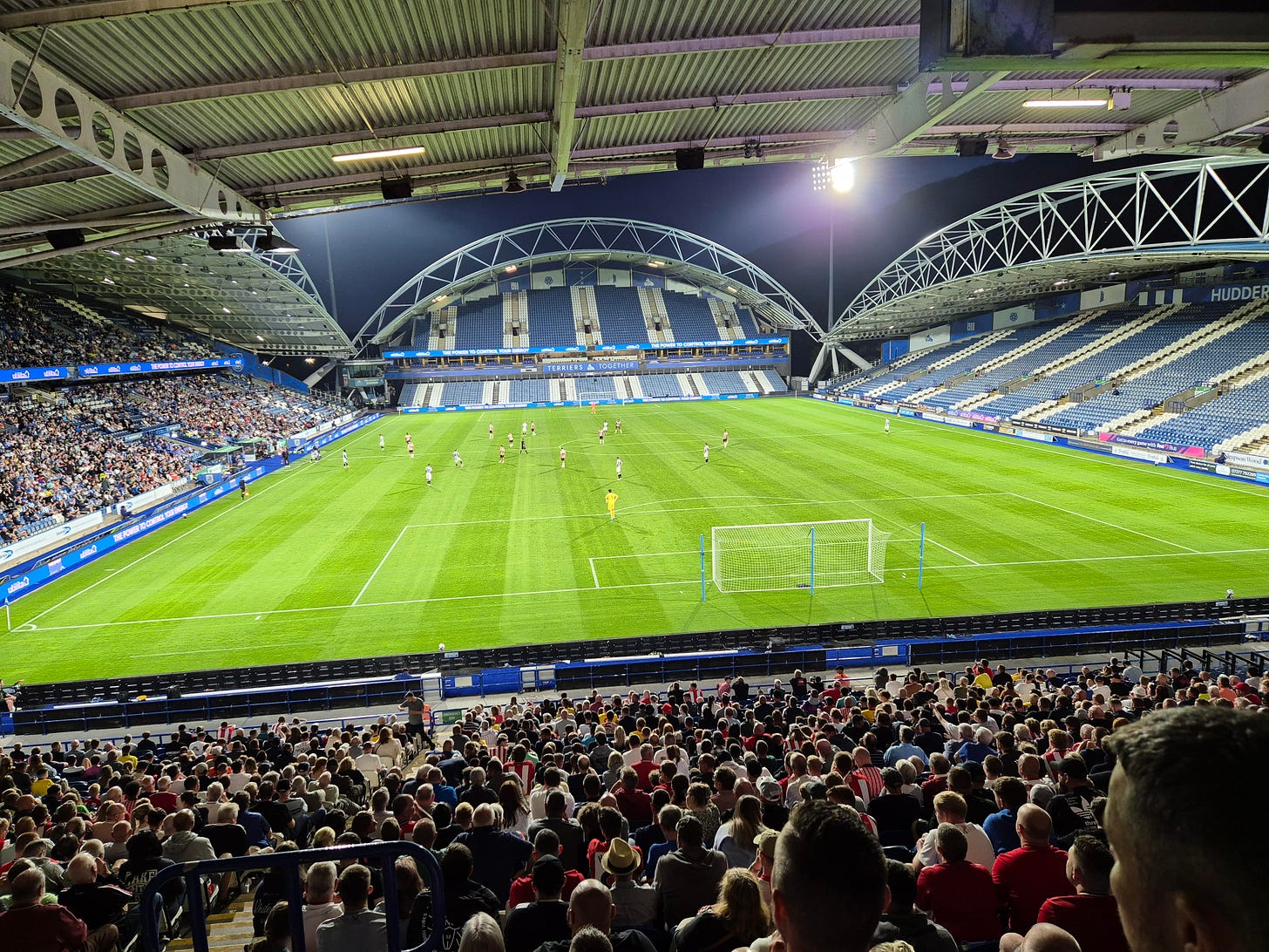 Onto Huddersfield then. Just me and my son. Couple of buds for the train with a firm plan of finding food and a pool table pre-match. My memory serves me well and we end up in The Warehouse, pizza for the boy and a Bollywood burger for me. With 4 pool tables, daft dad has done well. And it’s only a 20-minute walk to the ground. Naturally, I won the pool 2-1.