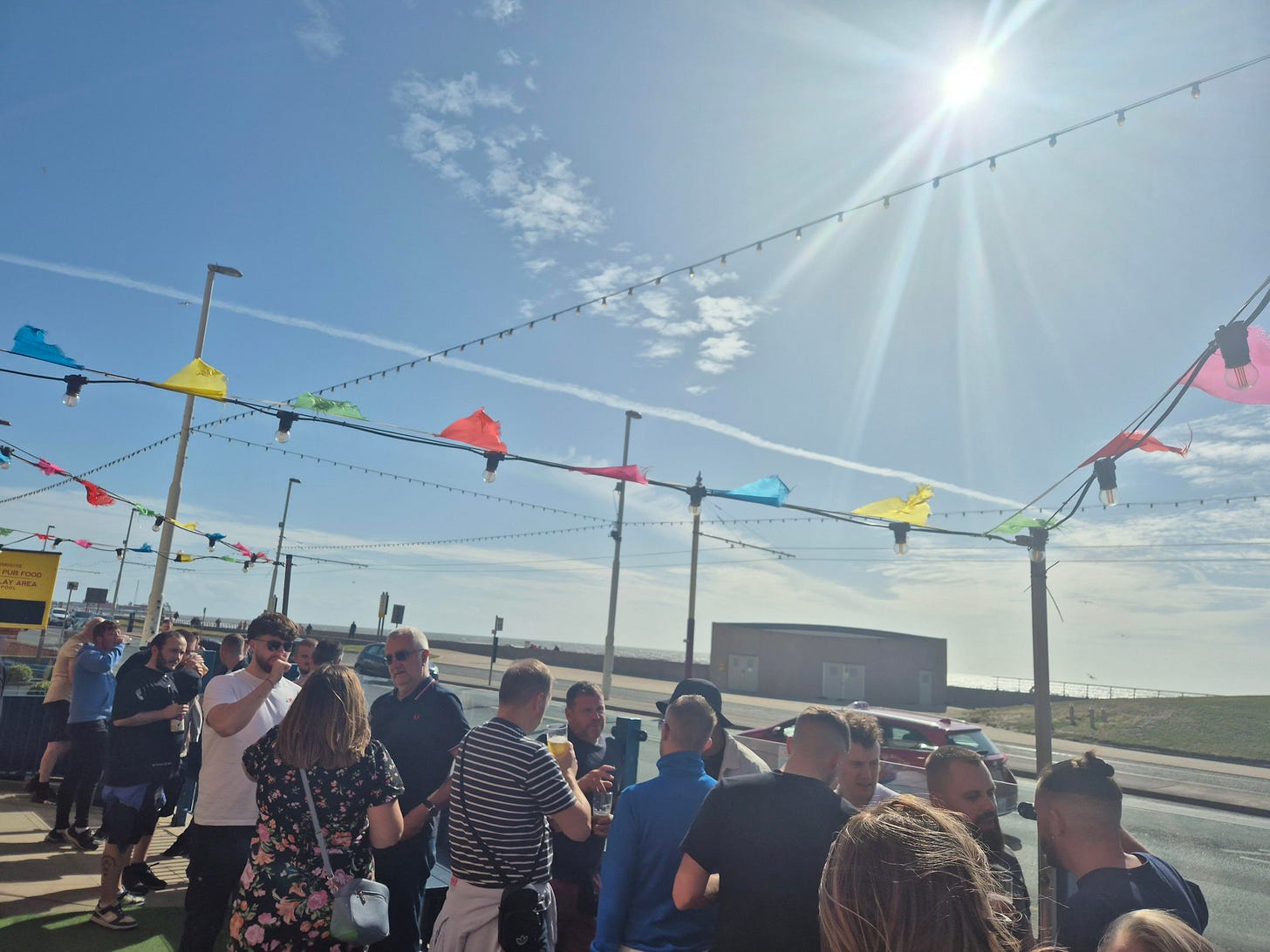 Three hours later, we pull up on Seasiders Way. Let the fun and games commence. Straight over to The Manchester, for some cheap and cheerful beers. In the sunshine. Lovely. It did come as somewhat of a surprise that 90 minutes later my son (15) was asked to leave. "We can't have kids in here." But that gave me and him an opportunity. And you should never pass up an opportunity, especially when that opportunity is seaside chips. Chips and curry sauce actually which we washed down with a drink outside the far more accommodating Happy Scots Karaoke Bar, before jumping back on the bus and heading to the game.