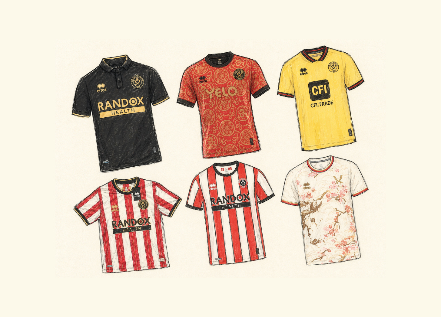The Blades play in red and white stripes, which, while undoubtedly more engaging than a block colour shirt, is difficult to reinvent every 12 months. Yet Erreà managed to provide novelty home and away, from little colour accents creeping along plain stripes, to pared-back badges, to some questionable collar decisions. Then, with away and third choice shirts, there was even more fun to be had.