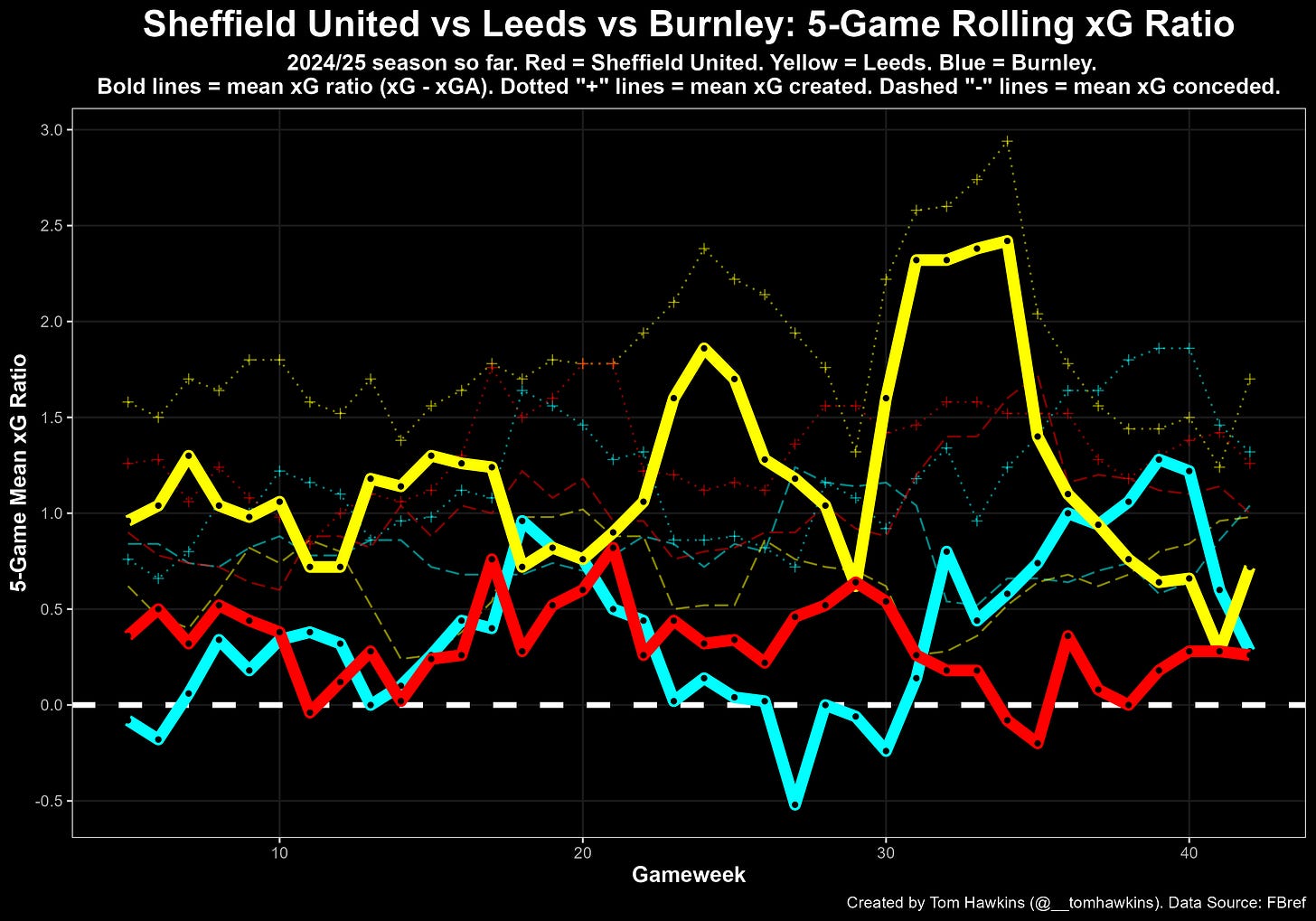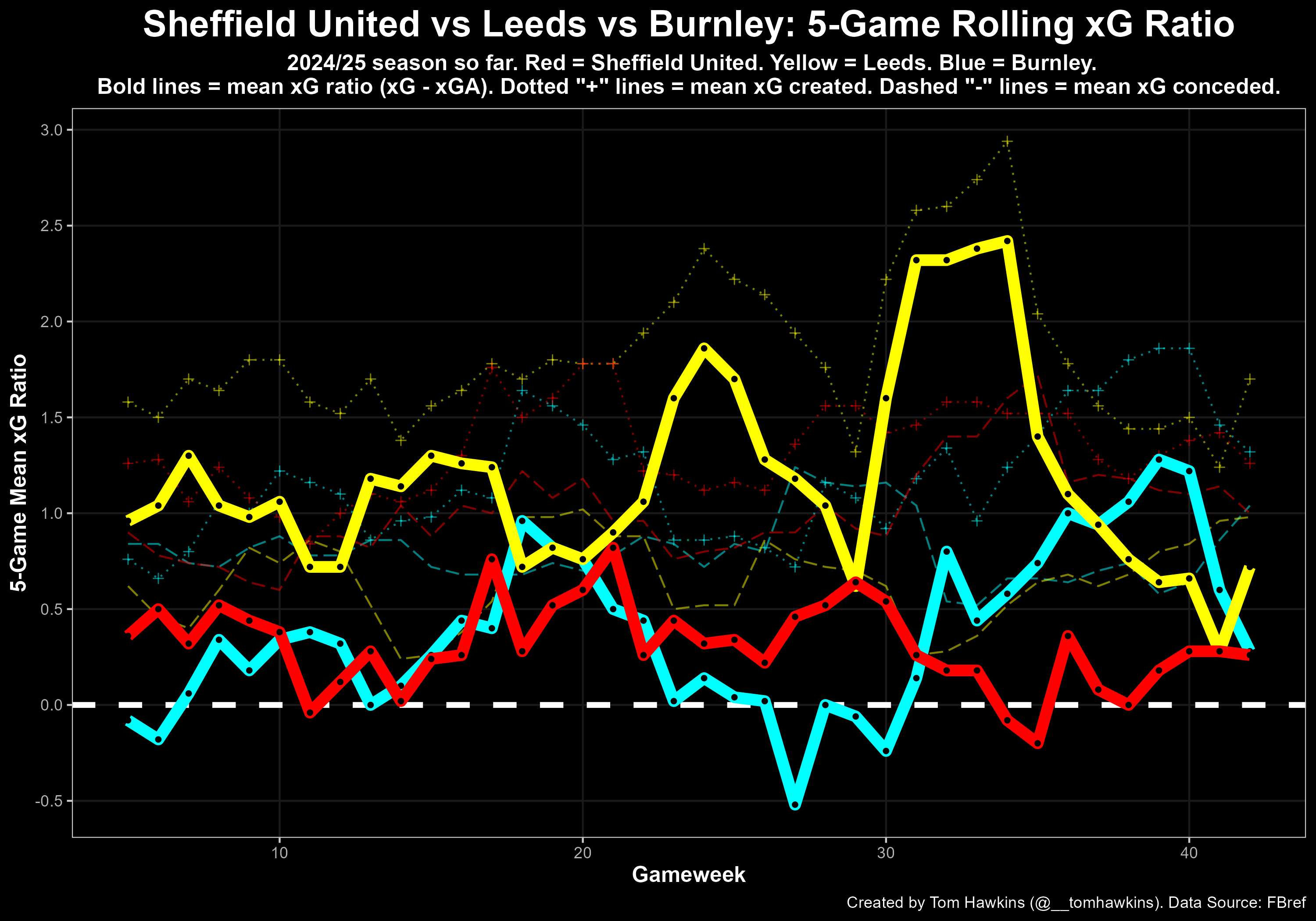 In terms of interpreting the graph: red lines represent data for Sheffield United, with yellow and blue lines corresponding to Leeds and Burnley respectively. The bold lines show the five-game rolling xG ratio, while the faded dotted/dashed lines in the background provide further detail about the average xG being created and conceded during that stretch.
