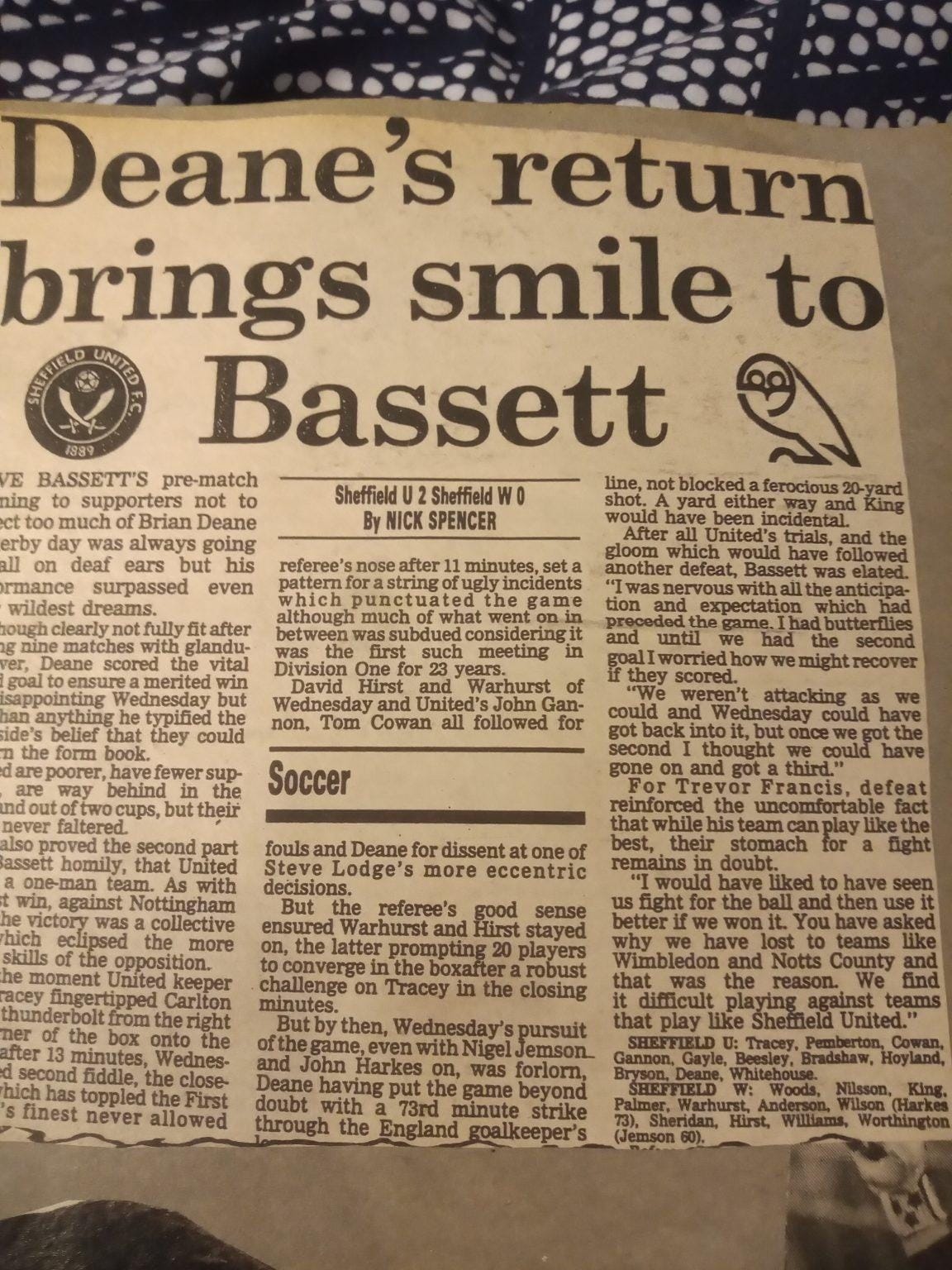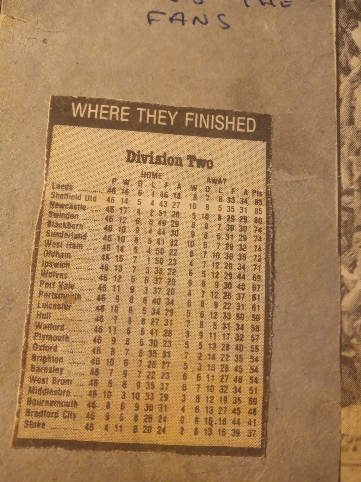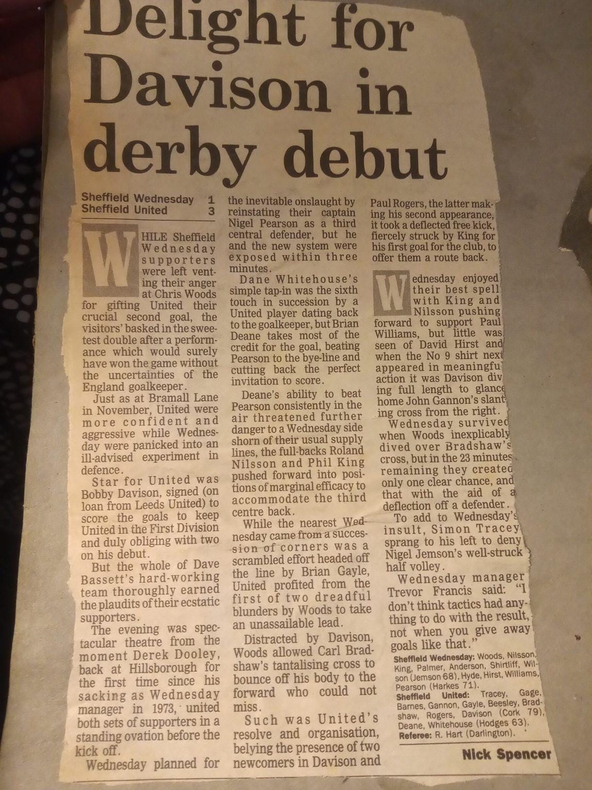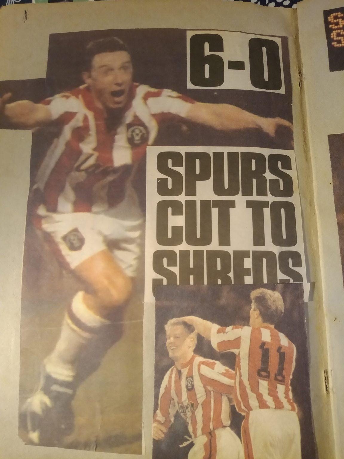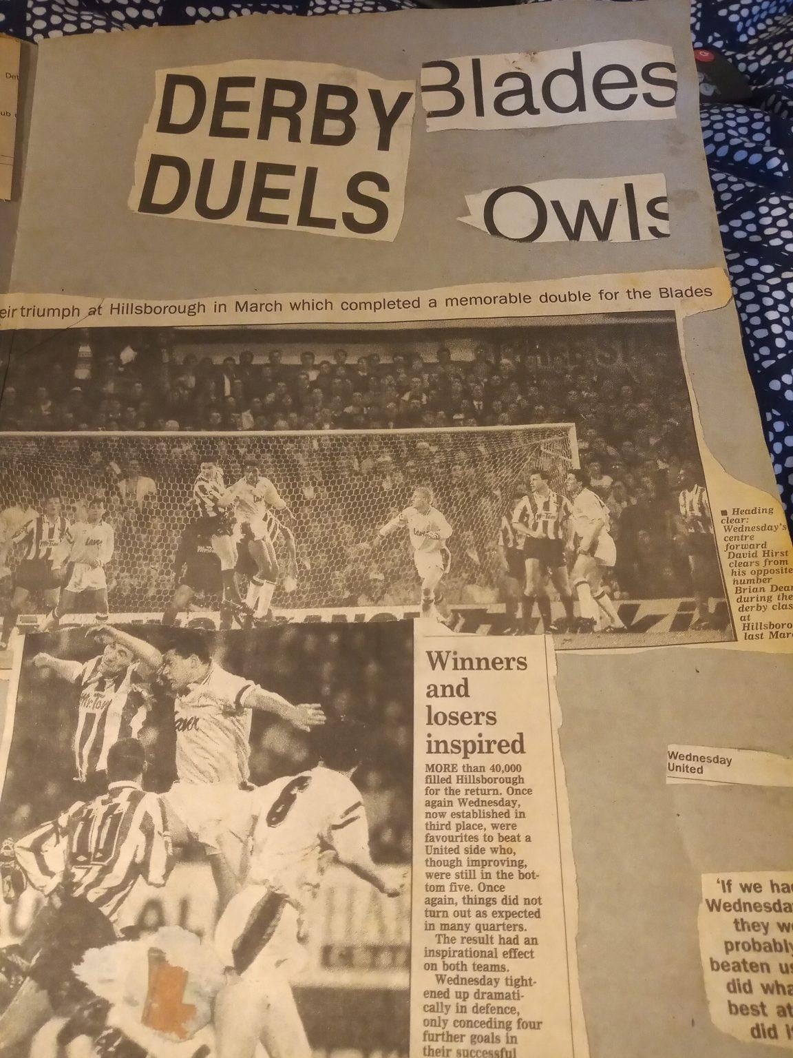 There are eight full page cuttings in the scrapbook dedicated to this win. It fills up a quarter of the book and I was running out of space, which might explain why I bypassed the following four months of the season and dived straight into the return fixture at Hillsborough. By this point United had picked up somewhat but were still in deep trouble at the bottom. Wednesday, meanwhile, were genuine title contenders. My dad sat in the Wednesday end for this one so I did not go, but the rest of this first scrapbook is taken up by cuttings of our famous derby double, so this must have been a big thing for me even back then.