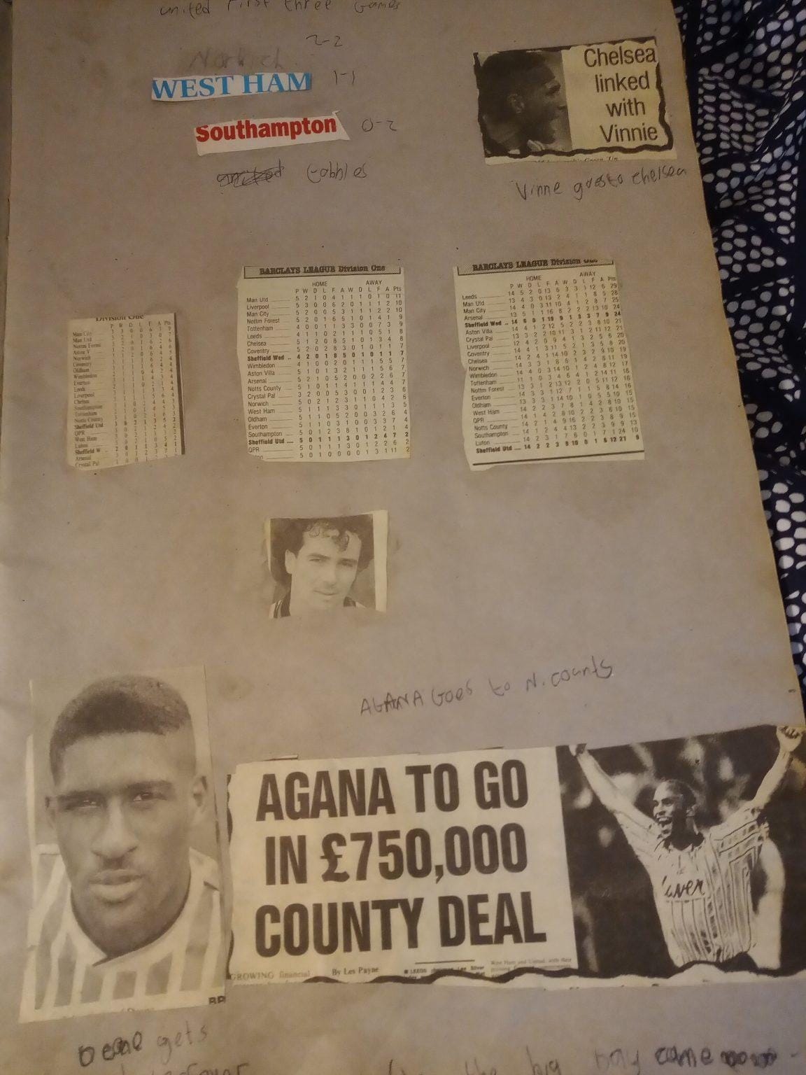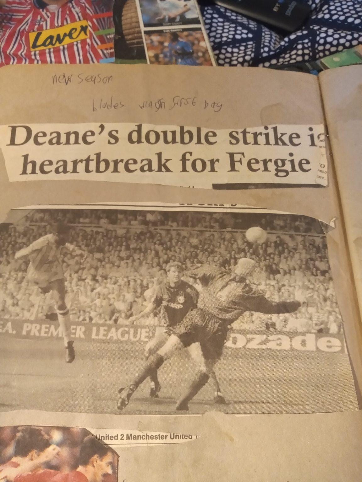 None of the players featured would make the squad as it turned out due to England not qualifying. The fact Deane was seen as a contender in 1992 though showed just how much he had established himself in the top flight. Of course the 92/93 season was the start of the Premier League, although you would not have known it looking at this scrapbook. Deane’s goal against Manchester United is in there, but there is not a hint of how momentous that moment actually was. The first goal in Premier League history, tucked away without fanfare by my younger self.