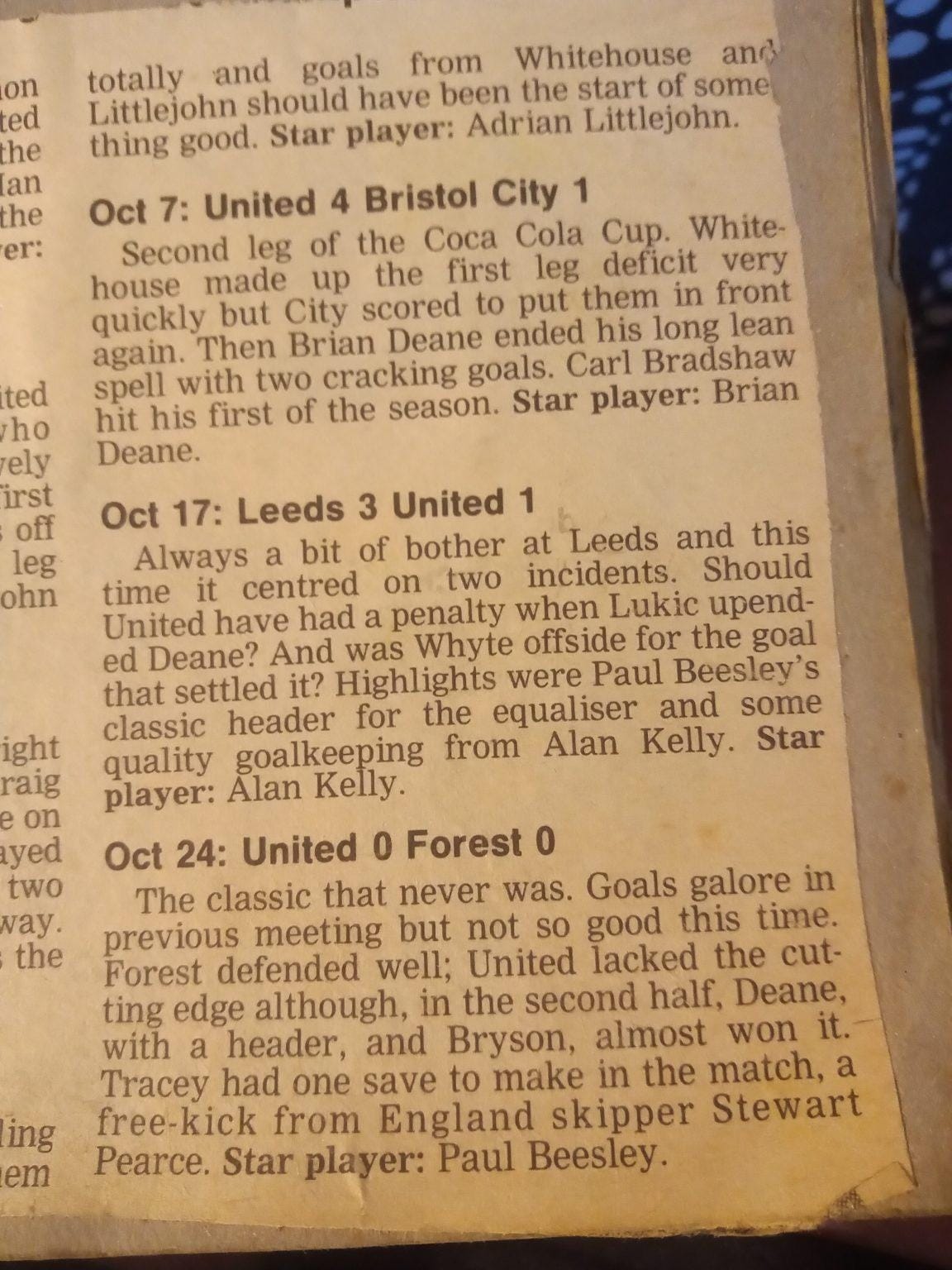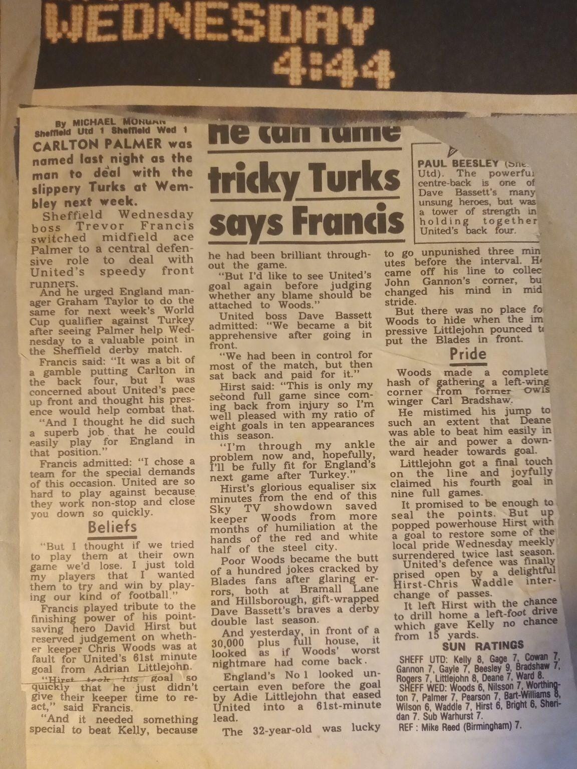 Then came the first Sheffield Derby of the new season. Unfortunately this one did not hit the heights of the previous two as the shares were spoiled in a 1-1 draw. The Sun decided to use this game to make a seven paragraph case for Carlton “Leighton” Palmer to be included in the England team. It really is a wonder why we did not qualify.