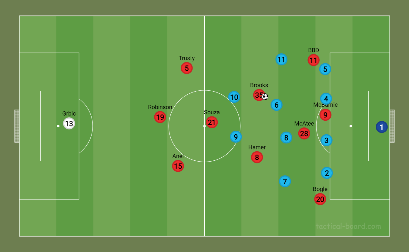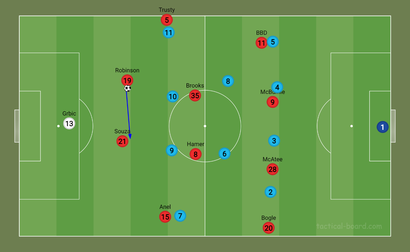 However, I have a problem. We are too willing to allow opponents possession and fail to engage high up the pitch, and that feels like a big waste of our energetic and aggressive players such as Hamer, BBD, Brooks and McBurnie. They all have the mental and physical attributes suited to a high press.