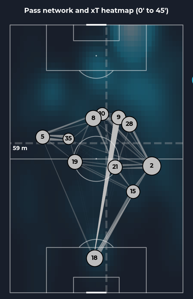 The data matches up with the eye test. We create the least Expected Threat per game in the league (0.98). We have the lowest “build-up” pass completion (69.5%), meaning our system is ineffective from a progression standpoint. And opposition teams also complete more defensive actions higher up the pitch against us than against another team in the league (48.6m from their own goal). In short, our current set-up is a problem.