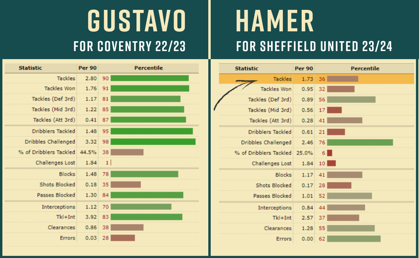 Last season, Coventry created more chances on the counter and more chances following high-pressing regains than any other team in the Championship and Hamer played a significant part in that. Here’s his defensive data from last season with Coventry (who averaged around 47% possession per game) vs this season with us (36%).