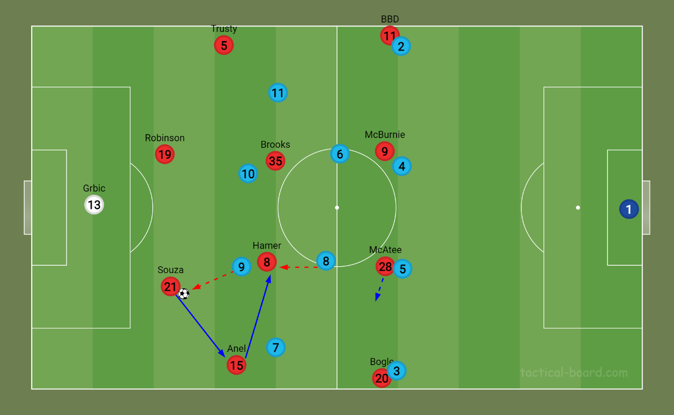 This pressing structure would usher the opposition’s build-up play wide where we can then force the ball out of play or turn the ball over in the opposition half and allows us to get Hamer into dangerous positions in transition if we were to win the ball back.