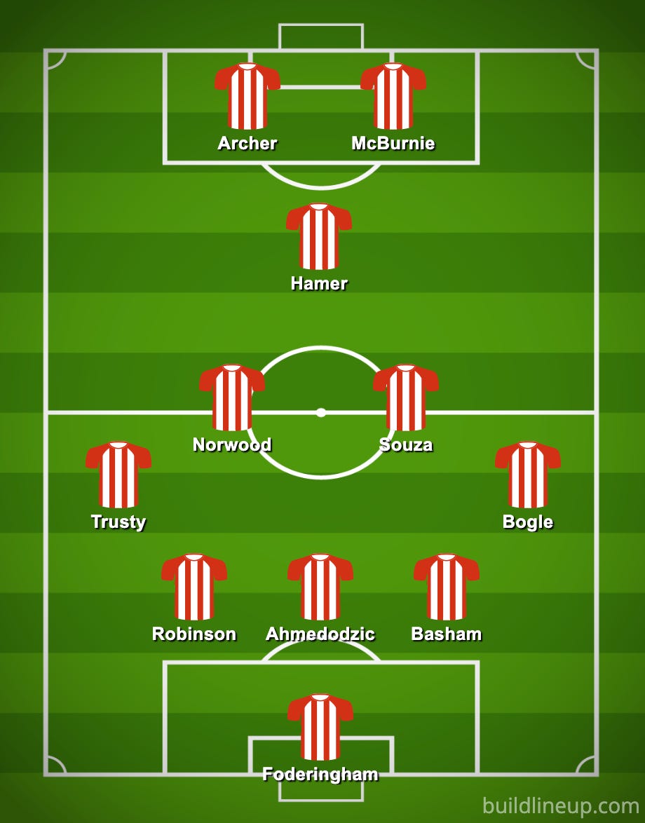 But Heckingbottom described this game as an opportunity for those who haven’t been playing. When he says that, I intuit Trusty, Norwood, Davies and maybe Basham. Who out of those might start? We could see Trusty at left-wing back, a position he played last season for Birmingham despite being more of a traditional centre-back. I think he’ll start at LWB after Thomas struggled against West Ham. And given that Ahmedodzic has looked better in the centre of a back three, I think he’ll drop into Egan’s position and that means Basham has to start at RCB. Bogle has to start, so there’s your back five. I think Norwood comes back in for McAtee, which brings better build-up and also gives us the opportunity to bring on an attacking sub later in the game. And I think that’s probably it.