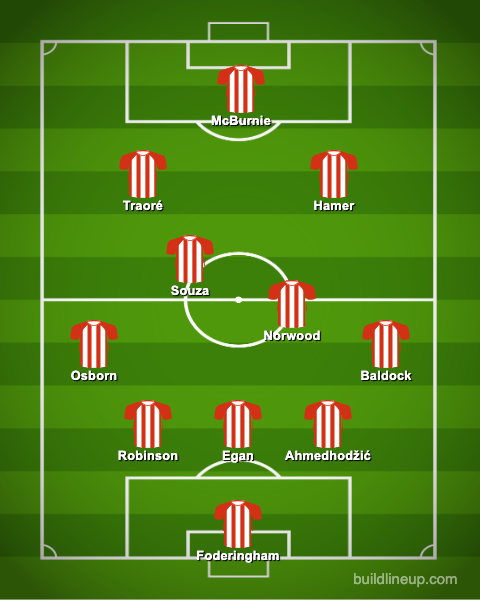 As Pep Guardiola is recovering from back surgery (must be hard carrying all those charges, to be fair), the H&M catalogue man will be watching the game from home. While his players could probably win with Kevin Blackwell in charge, this still opens up an opportunity for United to disrupt the City machine, be it through a pacy counter-attack or a Jack Robinson sliding spectacular. McBurnie has been training hard this week, and I think he’ll be called upon to lead the line with his hold-up play and phenomenally useful knack for winning pretty much every defensive header he’s attempted in his career. A back five will help keep things tight against City’s quick passing, and be solid when trying to react to the space in behind City’s midfield.