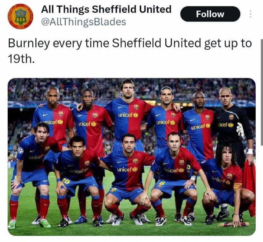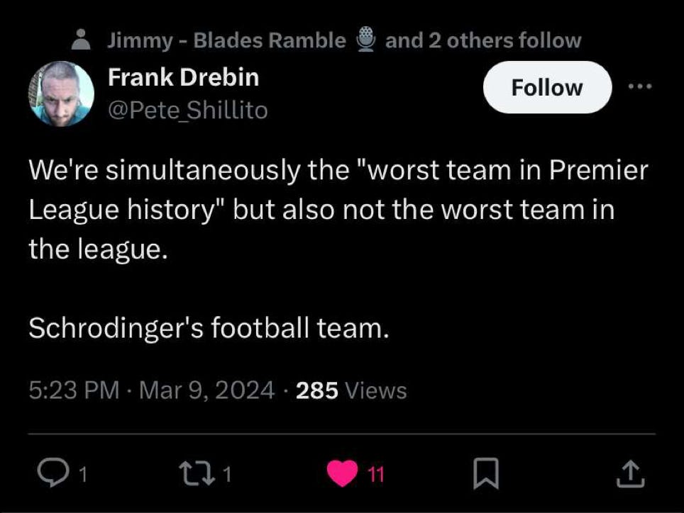 Despite spending around £400 billion, Chelsea were having a poor season and languishing in mid-table. Despite this, they still had quality and duly went ahead in the first half after United conceded yet another sloppy goal from a corner. The Blades were playing well though and Jayden Bogle’s equaliser after 30 minutes was thoroughly deserved. United were the better side from here on in but conceded against the run of play just after the hour mark and seemed to be heading for yet another defeat. Thankfully, their performance was eventually rewarded when, in the 93rd minute, Oli McBurnie knocked home to give United a more than deserved share of the spoils: