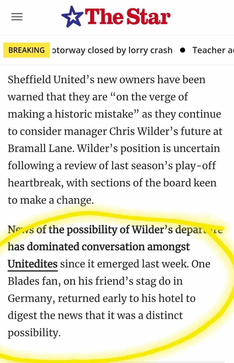 …Then the rumours started. At first, it was just a few people hearing a few whispers that Wilder’s future was uncertain. Then Football Insider claimed that the Blades board could be set to sack Wilder. This led to an initial flurry of speculation before it all died down within a few days. Nah, nothing in this…