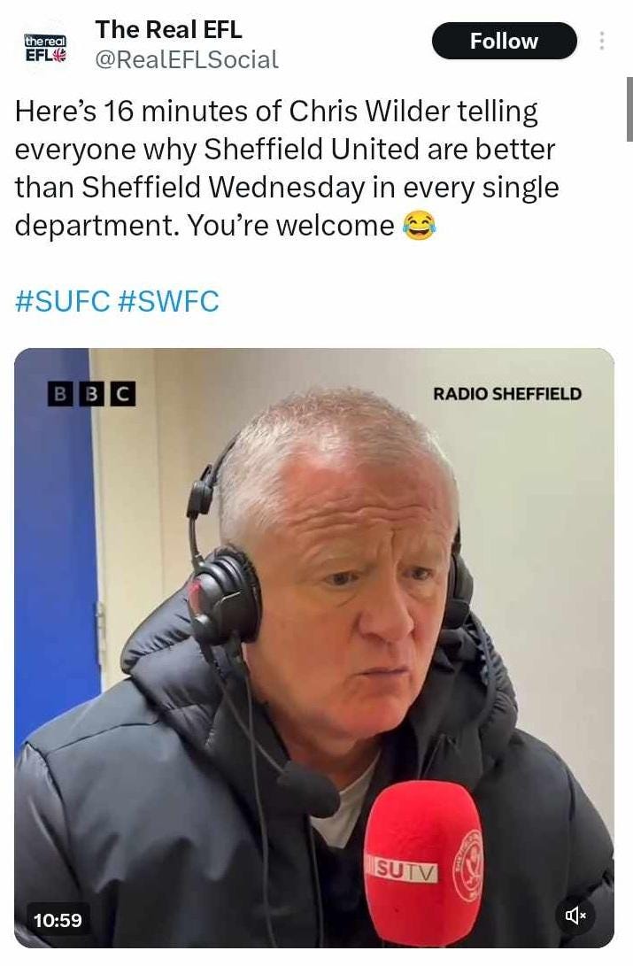 The main catalyst for the outbursts from Owls fans was Blades boss Chris Wilder. In his post-match interview, he pointed out several home truths about the two Sheffield clubs that didn’t go down well at all in S6.