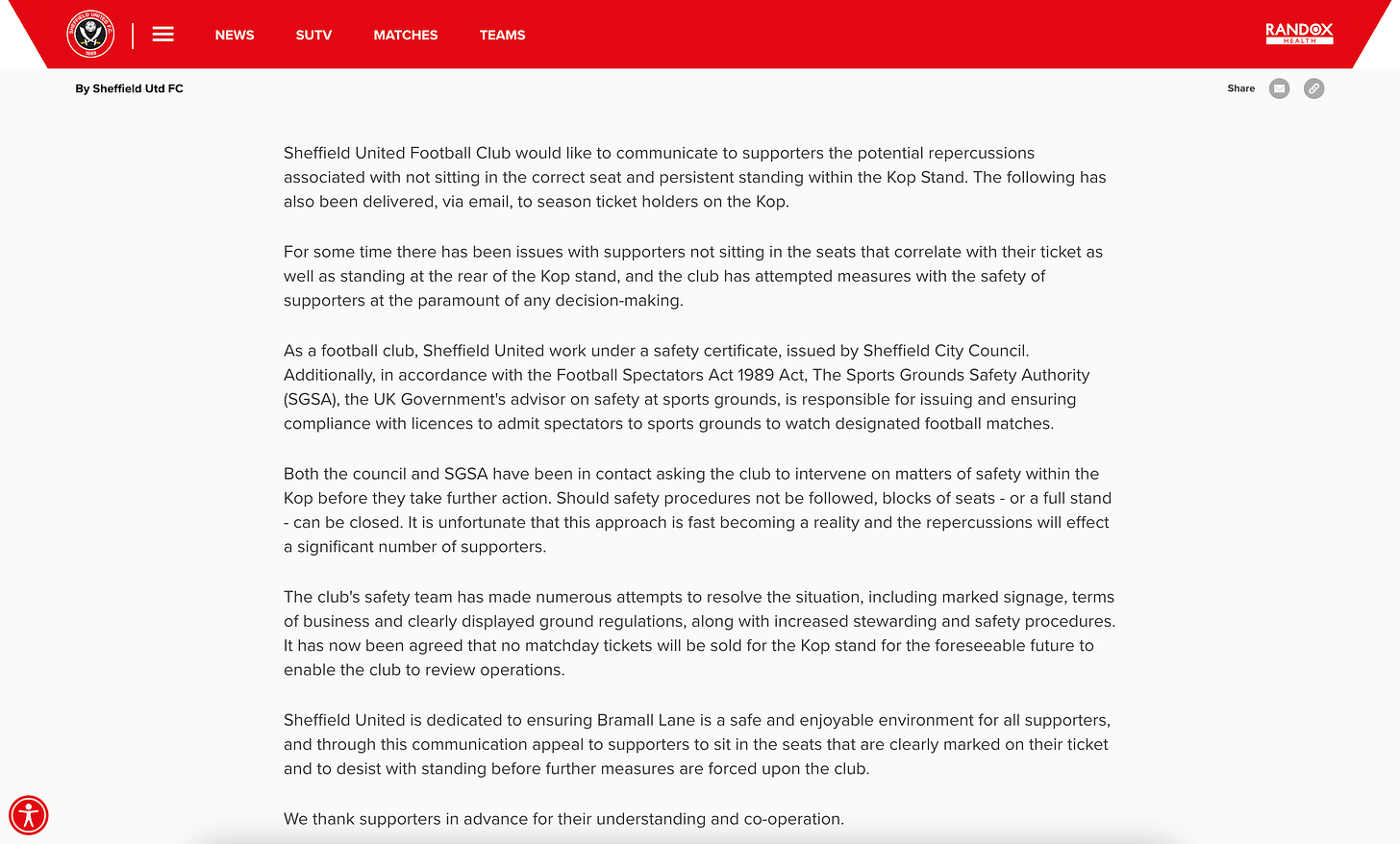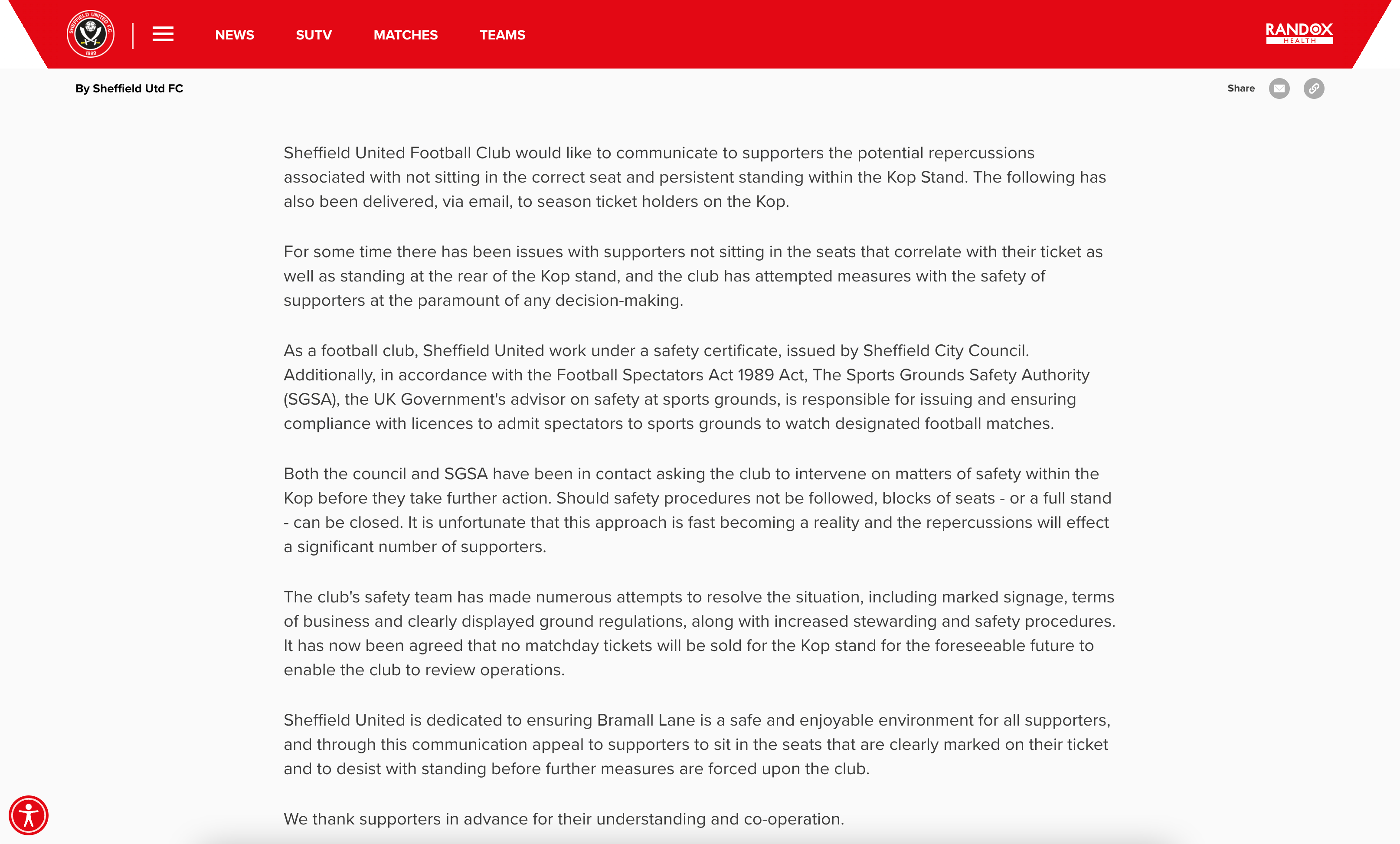 Being an ‘older’ and less mobile person, I do need to sit for matches and I was delighted when the Taylor Report decreed that grounds should be all-seater and for a while, this was enforced. If you read the Ground Rules or Stewards’ Handbook of any Club, you’ll find that they should enforce this, but unfortunately these days, the stewards (and even Police at times) just don’t seem to have the clout, authority or willingness to do this; or quite often the number of those “supporters” who try to sit or stand in the wrong place or cause overcrowding (such as standing on the steps and refusing to move) is too overwhelming for the stewards to deal with so they simply let it go and this creates a 'vicious circle' where nothing gets resolved. In the past, I’ve only witnessed this sort of behaviour at ‘away’ matches, and hadn’t realised that it was now infiltrating into the Kop at Bramall Lane. It is right for the Club to want to deal with the matter, but the way in which it’s been approached probably leaves a bit to be desired!