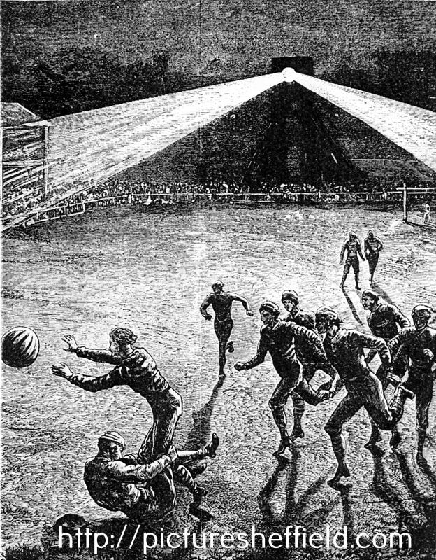 The experiment was organised by Sheffield-based company, Tasker’s Engineering. Four lamps were hung some 30 feet high in the four corners of the ground and were powered by two low wattage Siemens-made generators behind each goal. The illuminating power was equal to 8,000 candles.