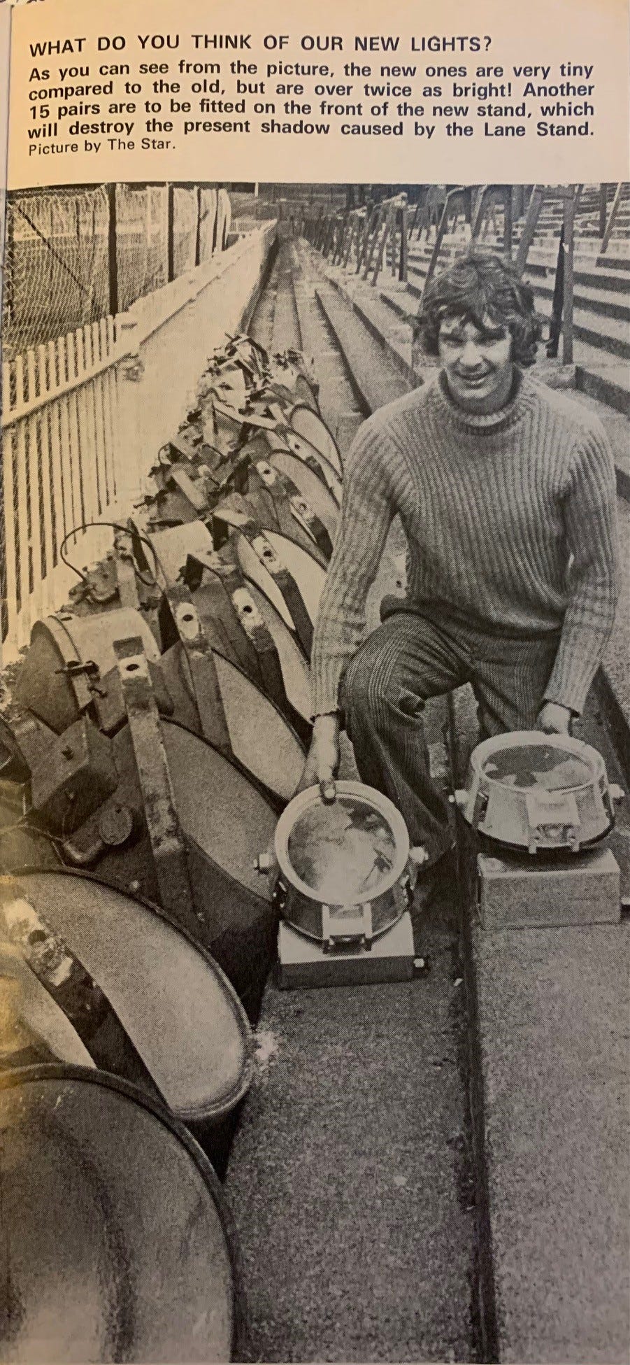 Club Director E Senior Atkin was responsible for installing the first set of permanent lights at the Lane during 1953 at a cost of £10,000. There were four squat and chunky 75ft pylons. At first, they were only used for training but on Tuesday 16 March 1954, they were turned on for a friendly v Rotherham United. A crowd of 17,787 saw United win 2-1.