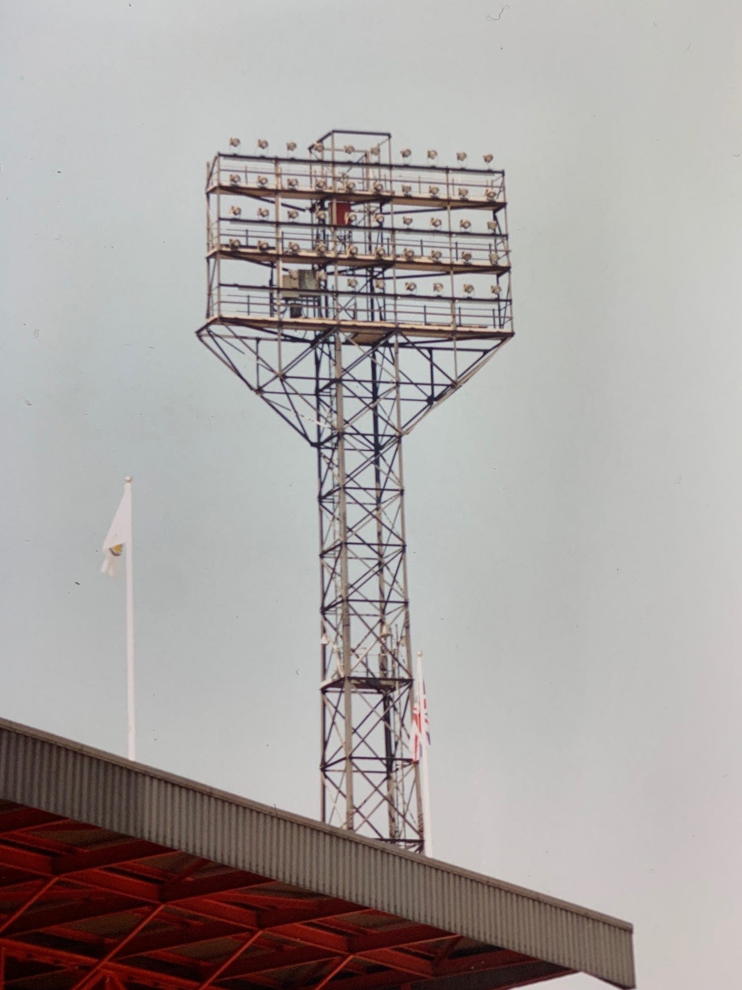 In 1958, Director Mr Ernest Selwood was responsible for adding the central pylon in the John Street stand roof. This pylon was 140ft in height, almost double the height of the squat corner pylons. There were 40 lamps on the new pylon, bringing total number of lamps to 120.