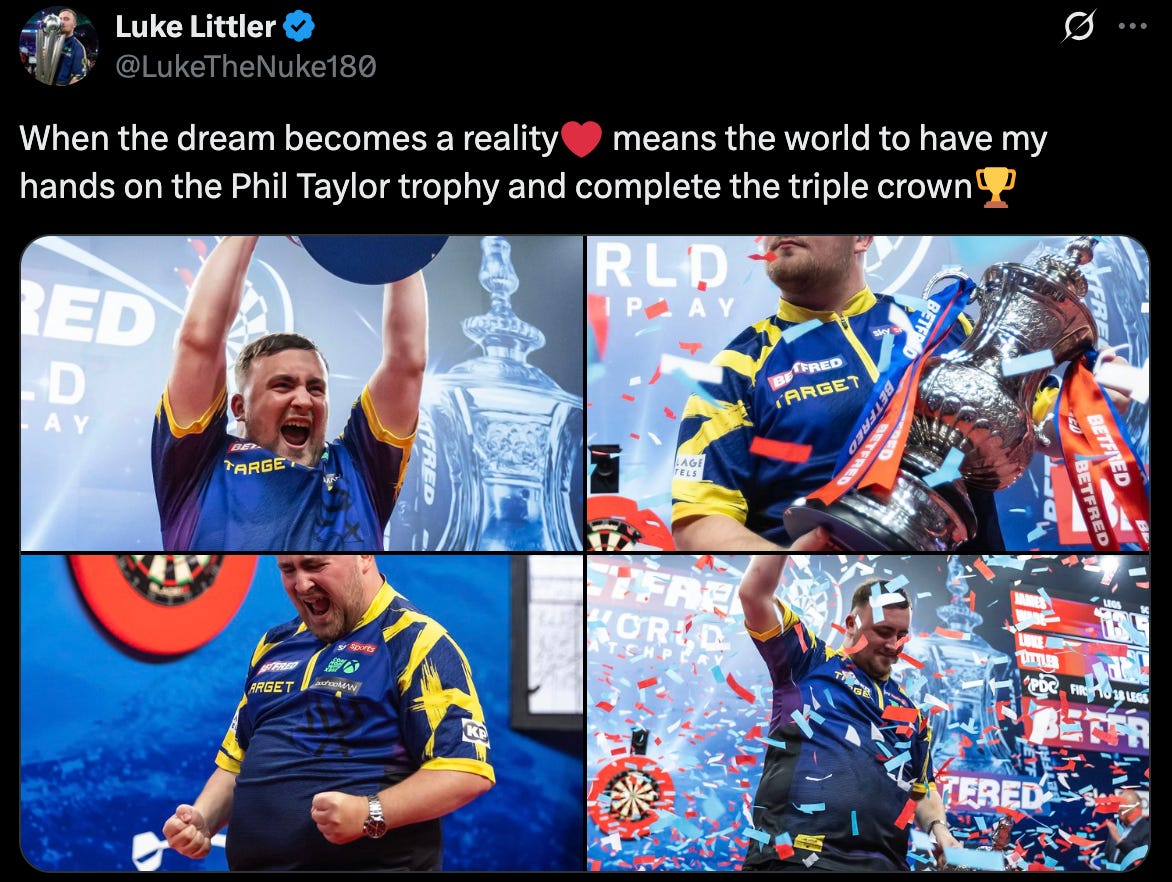 Littler even took the time during his lean period to respond to some boos in Sheffield at his expense with an Instagram story on the evening of the play off final: “Heard some boos on Thursday night, karma always comes back to bite you 🙈”. Not now, Luke.