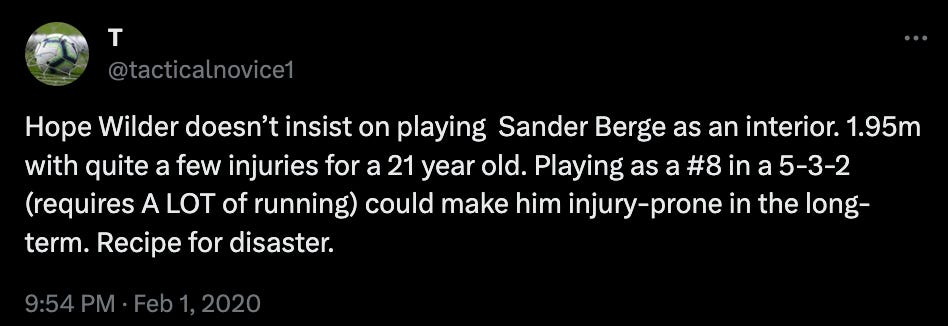 When you make a club record signing, it's in your interest to protect your asset. Sander Berge arrived with a history of injuries. In February 2020, one Tweeter made an astonishingly prescient argument about the relationship between Berge's positioning and possible injury.
