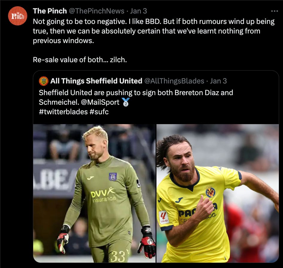 I took some flak for the post. Nothing bad-mannered, just fans pointing out that any nascent deal for Ben Brereton Díaz or Kasper Schmeichel would be a loan, and therefore any discussion of re-sale value was missing the point. It's a fair argument.