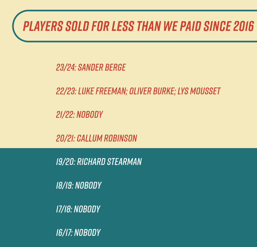 The fees paid for our next batch of would-be value assets – Sander Berge, Oliver McBurnie, Callum Robinson, Ben Osborn, Lys Mousset, Oliver Burke, Jayden Bogle, Max Lowe and Aaron Ramsdale – total around £100m (according to TransferMarket). I've not even mentioned Luke Freeman there as he wasn't under 25, but his signing broke every one of the three principles.