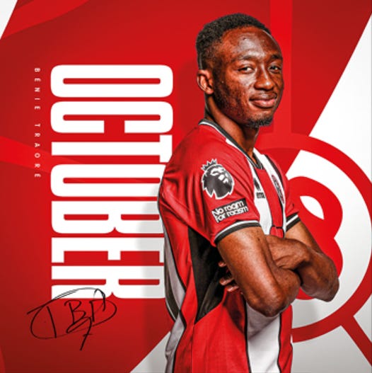 October’s man, Benie Traore, is already out of the door after a mere 400 minutes of action in red and white, although in theory he could still be our player by that point. Ditto Anis Slimane (November), although I wouldn’t bet on it. Auston Trusty gets the December slot – a good choice as the summer signing most likely to still be in our XI by then, IMHO.