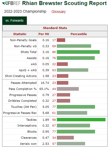 For starters, he takes a lot of shots – in United’s squad, only McBurnie can top Brewster’s 3.16 shots per 90, and McBurnie takes more shots than anyone else in the Championship. That translates to 0.33 non-penalty expected goals per 90 for Brewster, which is in the 71st percentile – encouraging signs even if his shot conversion so far lags behind his expected numbers.