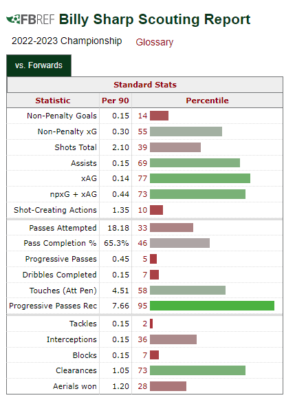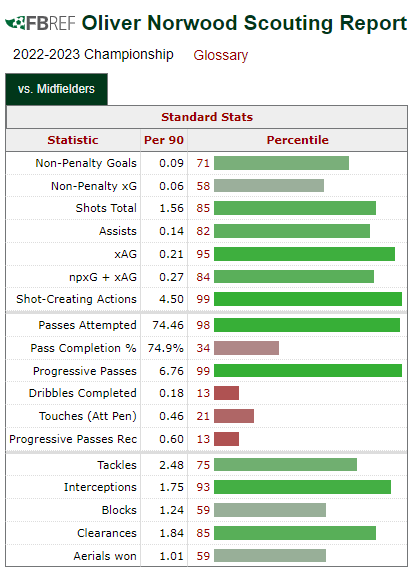 These scouting reports are taken from FBRef.com, and are a fantastic way of seeing how well a specific player stacks up against his peers. The percentiles are the ones I’m most bothered about in this article: the higher the percentile, the better a player is when compared to other Championship players of that position. Basically what we’re looking for here is lots and lots of green.
