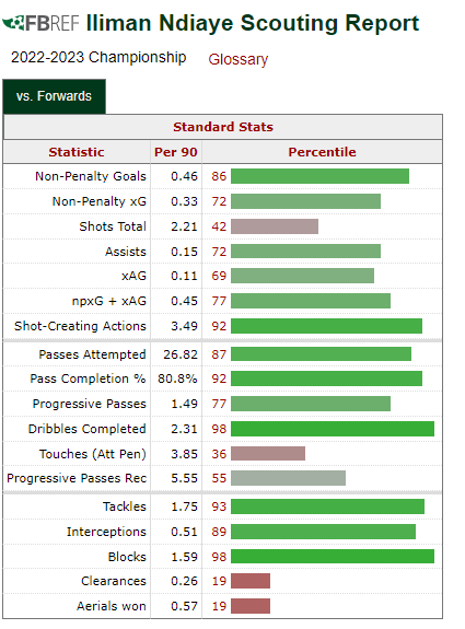 If anything, we might want Ndiaye to spend more time in the penalty area (36th percentile for touches in the box), and to shoot more. Although that in turn may impact his insanely-good dribbling and shot creation numbers so far. What the heck, just let Iliman do whatever he wants: it’s working.