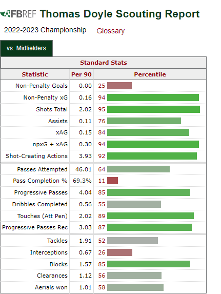 As you can see here, Doyle scores highly for shots, shot-creating actions, expected assists (xAG), progressive passes and touches in the opposition box. He’s doing everything we’d want of a driving midfield presence, it’s just that his shots haven’t found the back of the net. Keep these numbers up though, and it’s surely a matter of time. As I said with Brewster, four or five goals in the second half of the season could be a big help in pushing us towards a top-two spot.