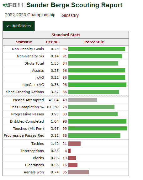 I’ll finish this on a high, with one of my favourite players to watch: Sander Berge. Just check out all of those lovely green bars on Berge’s scouting report when compared against other Championship midfielders:
