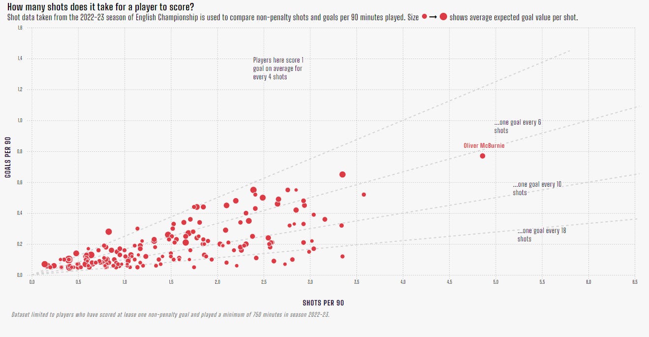 Nothing illustrates this better than this graph from Opta Stats Perform, showing how many shots players have needed to score a goal in the Championship this season. That dot way, way out on the right there? That’s our number 9.
