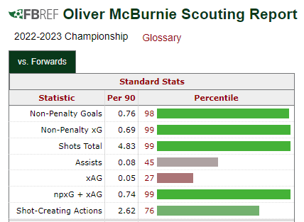 Fast-forward three months and McBurnie is the joint top-scorer in the Championship, and his attacking percentile numbers look like this:
