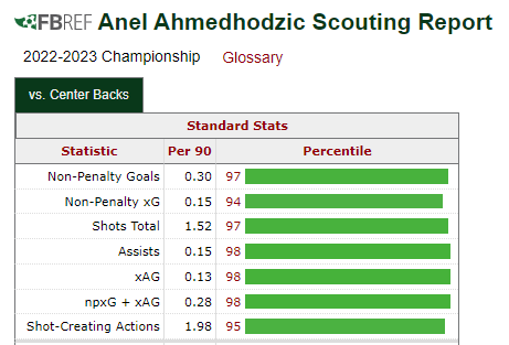 Statistically, it’s hard to overstate how impressive Ahmedhodžić has been. He has four goals and a pair of assists already, and his offensive contributions are no fluke – just look at the percentiles he occupies compared to all other centre backs in the Championship this season: