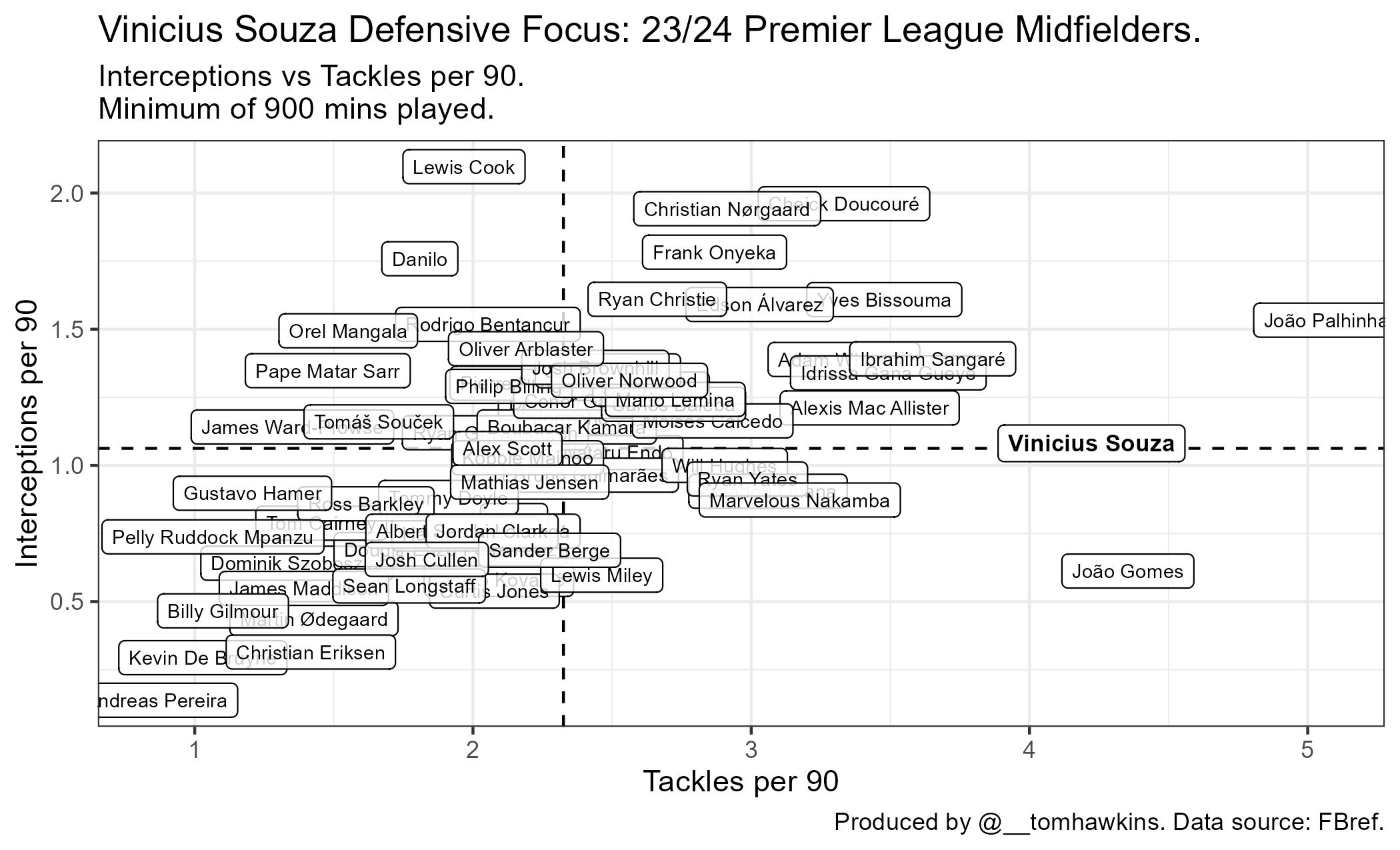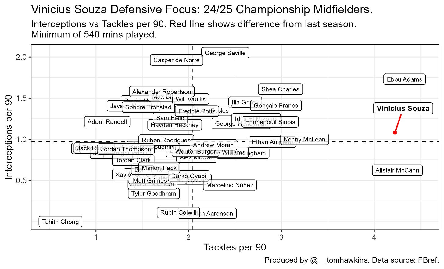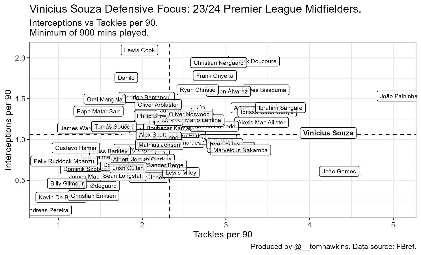 If we compare Souza's tackles and interceptions to João Palhinha of Fulham (who conceded 61 goals), it’s clear that an exceptional player in this position would perform more tackles and interceptions relative to fewer goals conceded. Like goalkeepers who make a lot of saves, the poorer a team is defensively, the more likely it is that data around tackles/interceptions is distractingly noisy.
