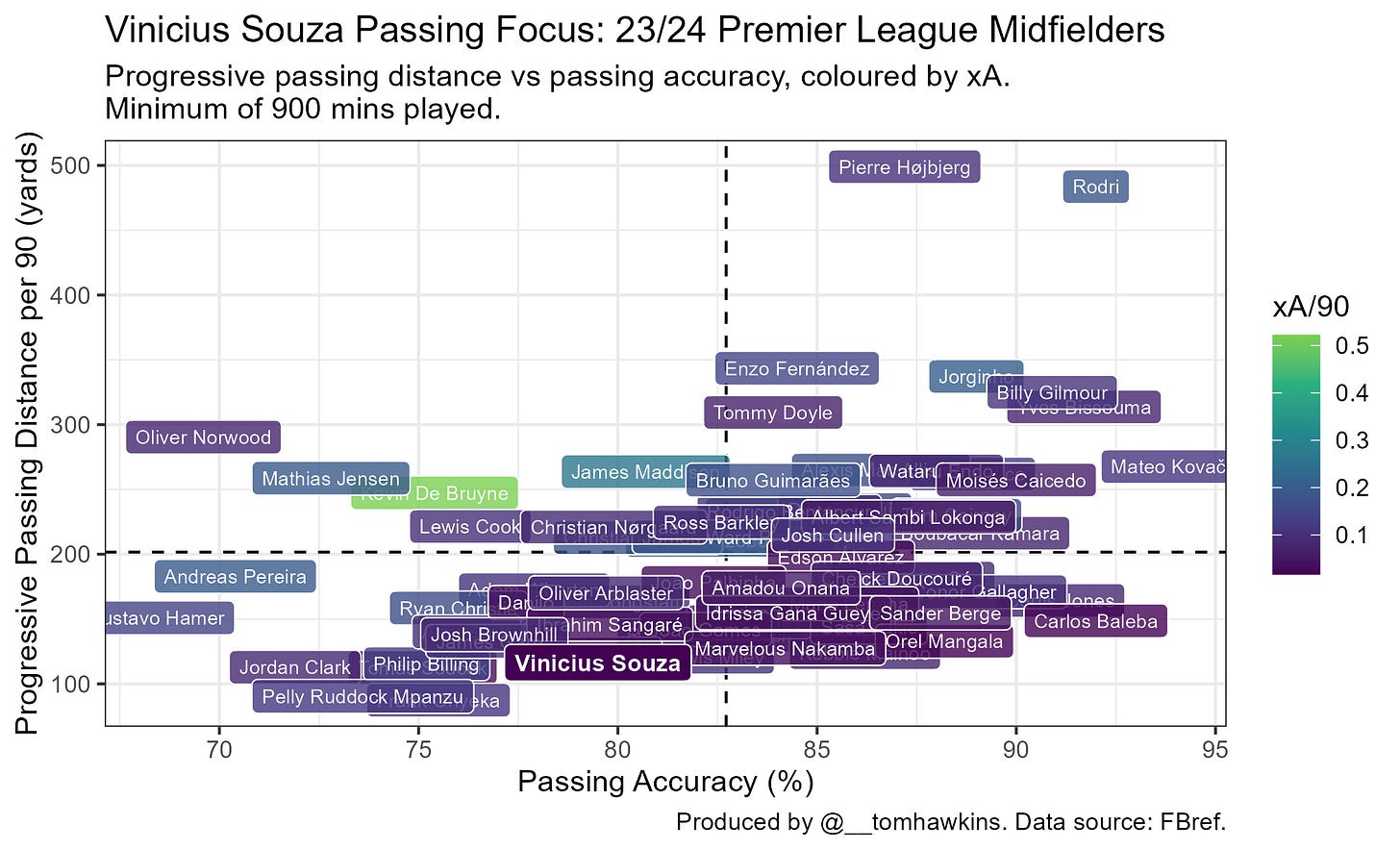 Put simply, he was one of the worst in the league at progressive passing (passes that move the ball closer to the opposition goal), and had a below-average passing accuracy too. His expected assist numbers (which put those with lower passing accuracy into context) were also the worst in the league for any midfielder to play a minimum of 900 minutes.