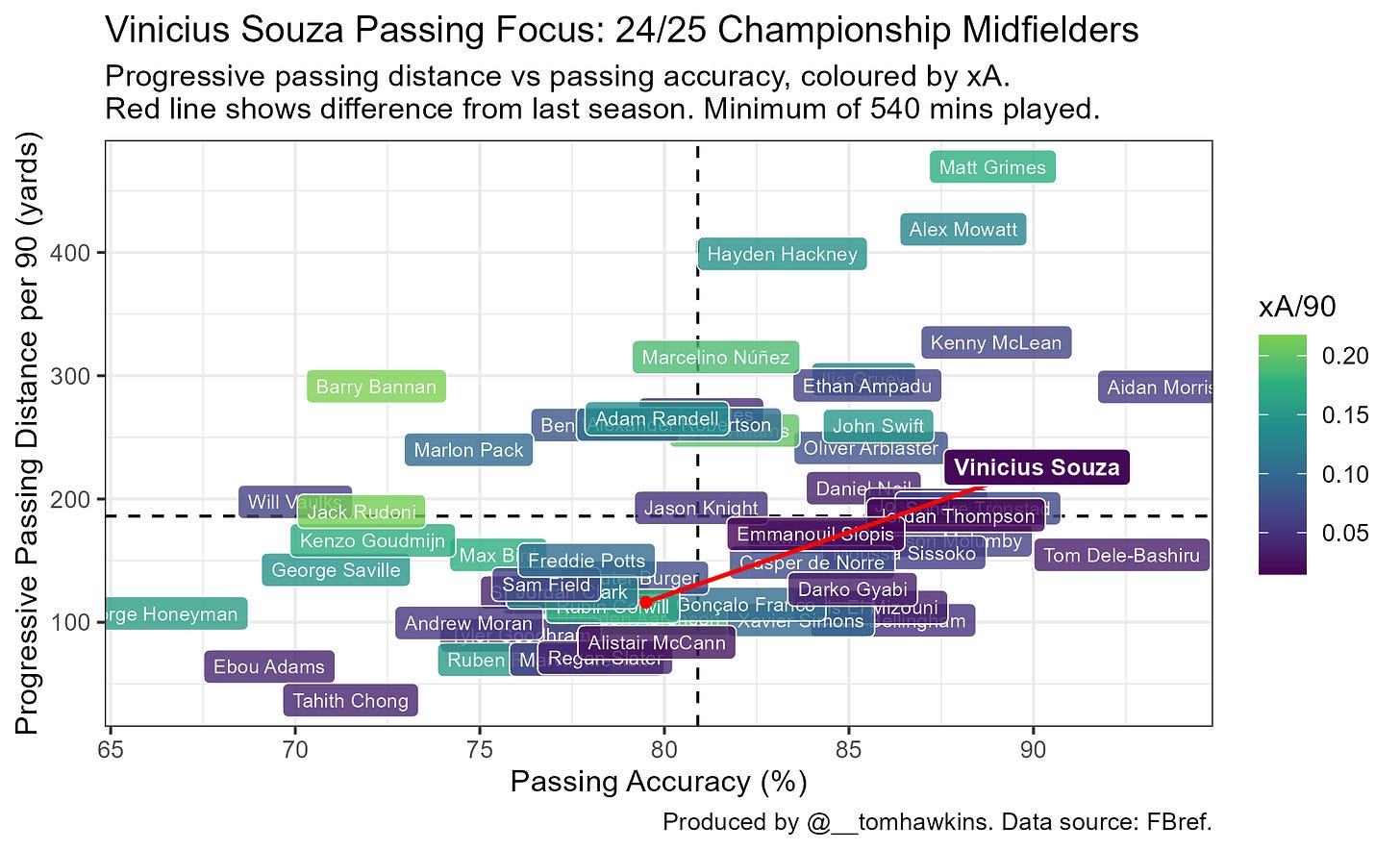 Well, I was wrong! If we inspect the plot below, the red dot is where Souza's progressive passing and passing accuracy numbers were last season, and we can see that he is currently displaying much better passing numbers this season.