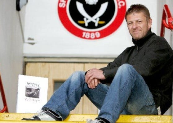 Blades fans old enough will remember that some shooting for the film took place at half-time of United’s FA Cup third-round match against Manchester United in January 1995. Sean, wearing full United strip with a supporting cast of supposed Sheffield United and Manchester United players, took a few penalties at the kop end and we all had to cheer when he scored. After a few indifferent attempts, he cracked one into the top corner, which made the final cut: